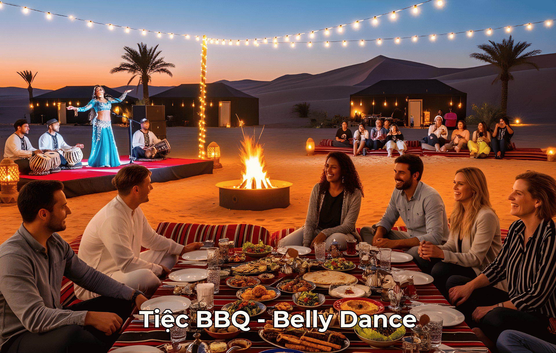 - Tận hưởng bữa tiệc tối BBQ buffet phong phú ngay tại trại sa mạc trong không gian đậm chất Ả Rập.