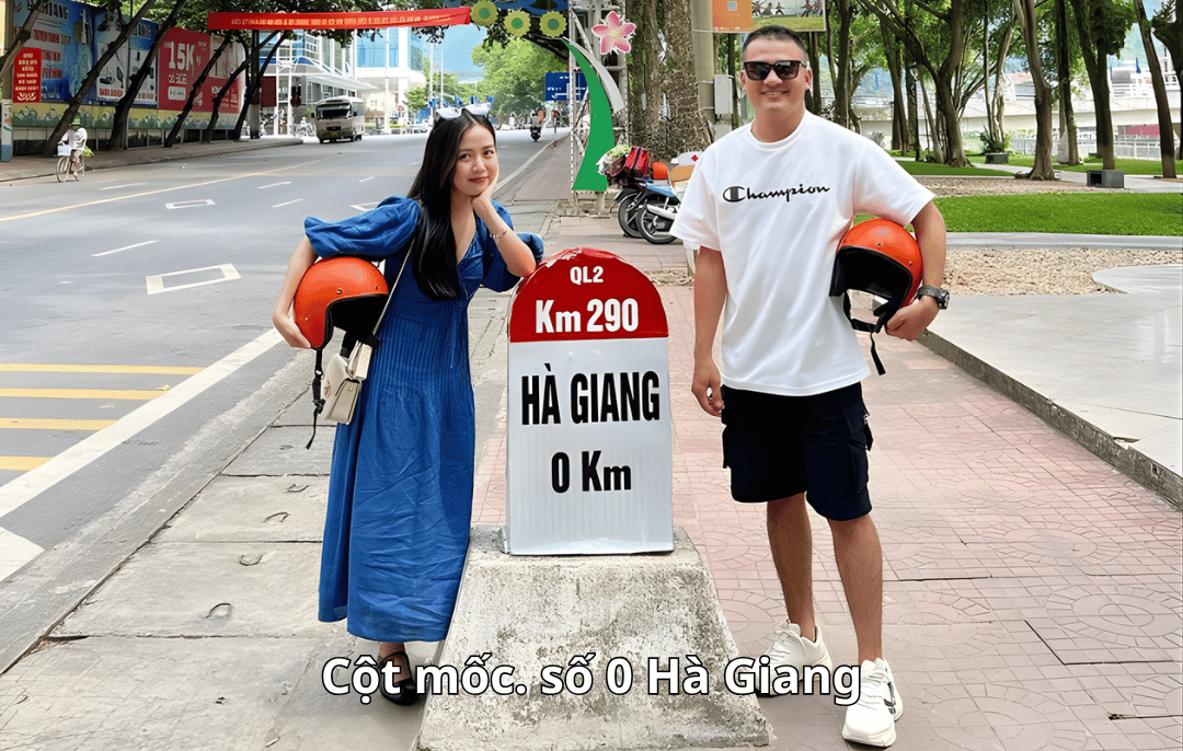 Đến sân bay Nội Bài, xe khởi hành đưa đoàn đi Hà Giang. Trên đường đi, đoàn dừng chân check-in tại cột mốc số 0 Hà Giang và dốc Bắc Sum.