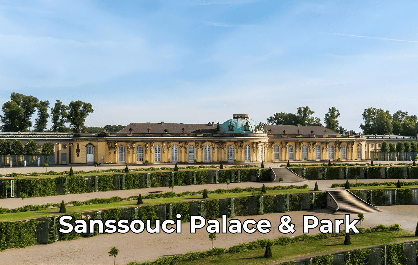 - Sanssouci Palace & Park (đã bao gồm vé): nơi được ví như “Versailles của nước Đức”. Cung điện mang phong cách Rococo, với kiến trúc thấp trải dài trên những bậc thềm vườn nho tuyệt đẹp. Du khách tham quan hiểu thêm về các điểm nổi bật tại đây: