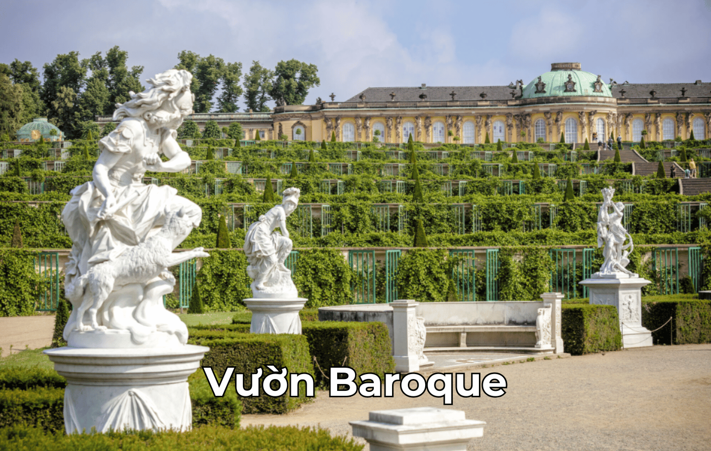 - Vườn Baroque rộng lớn với đài phun nước và tượng điêu khắc