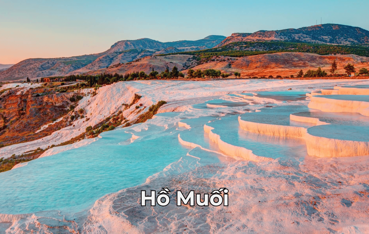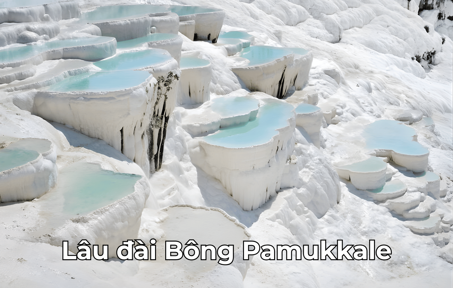 - Lâu đài Bông Pamukkale: Một di sản thiên nhiên thế giới, nơi có những dòng suối khoáng nóng chảy tự nhiên từ hàng ngàn năm trước tạo nên một kỳ quan vô cùng kỳ vĩ và độc đáo,được UNESCO công nhận là di sản văn hóa thế giới.