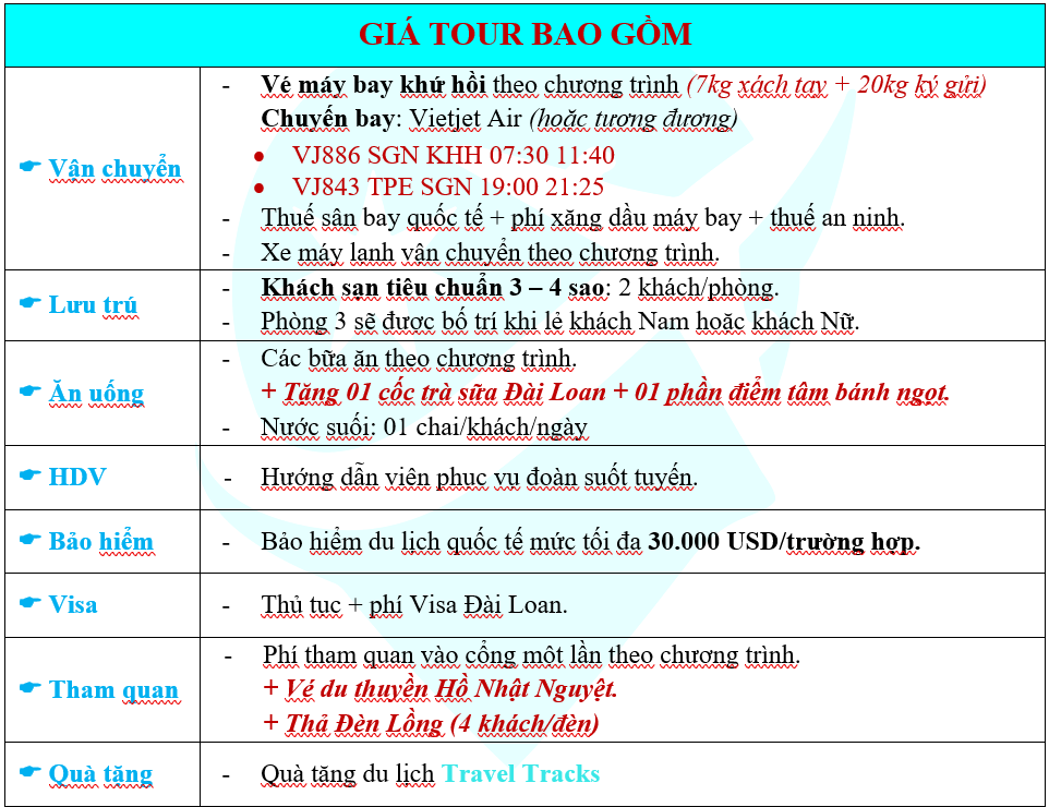 • Chương trình đặc sắc nhất thị trường, tham quan trọn vẹn những điểm đến nổi tiếng nhất Làng cổ Thập Phần, Làng Hinoki, Dã liễu, Tòa tháp Taipei 101, Phật Quang Sơn Tự,…