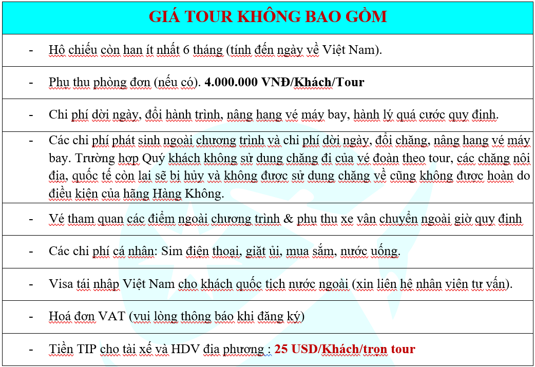 GIÁ TOUR KHÔNG BAO GỒM