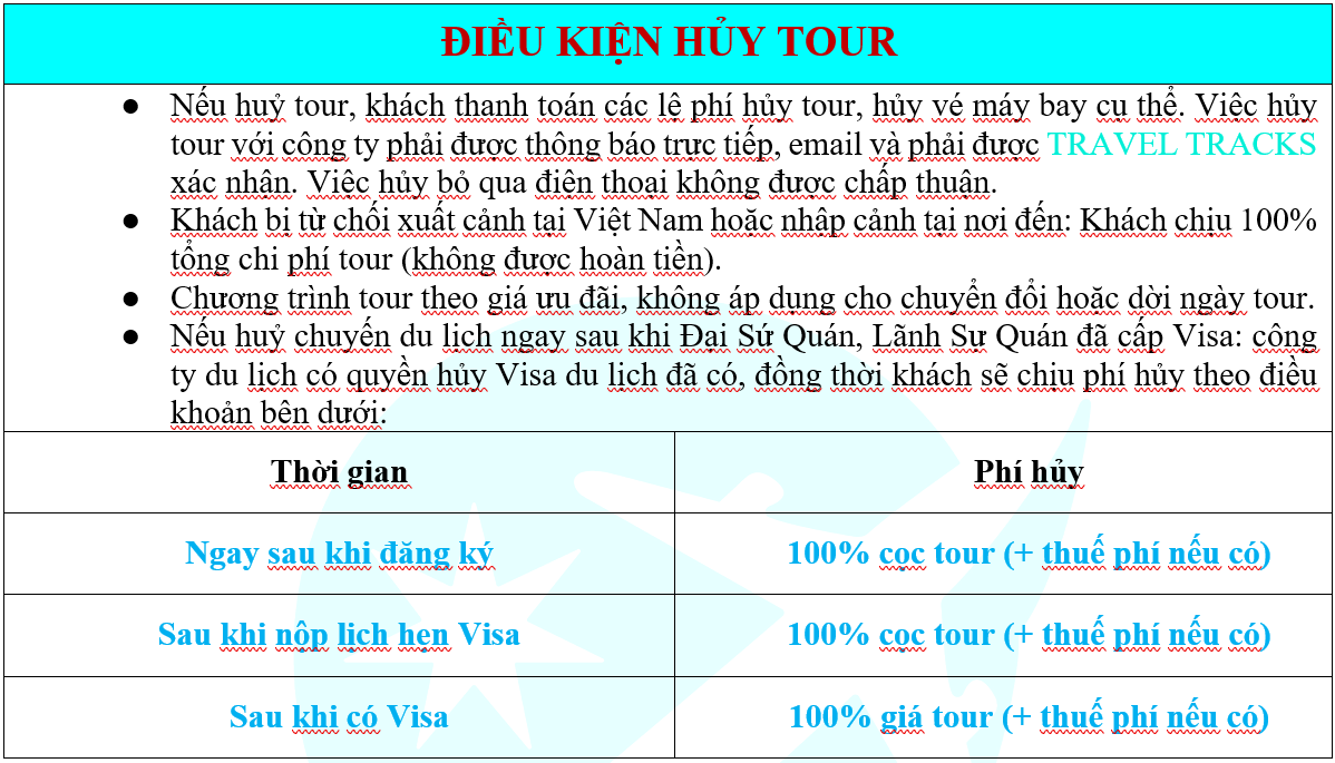 - Quý khách mang THẺ XANH (PERMANENT RESIDENT), ALIEN’S PASSPORT, TRAVEL DOCUMENT… khi đăng ký tour không trình báo, khi không xuất cảnh được, công ty TRAVEL TRACKS hoàn toàn không chịu trách nhiệm và không hoàn trả tiền tour.