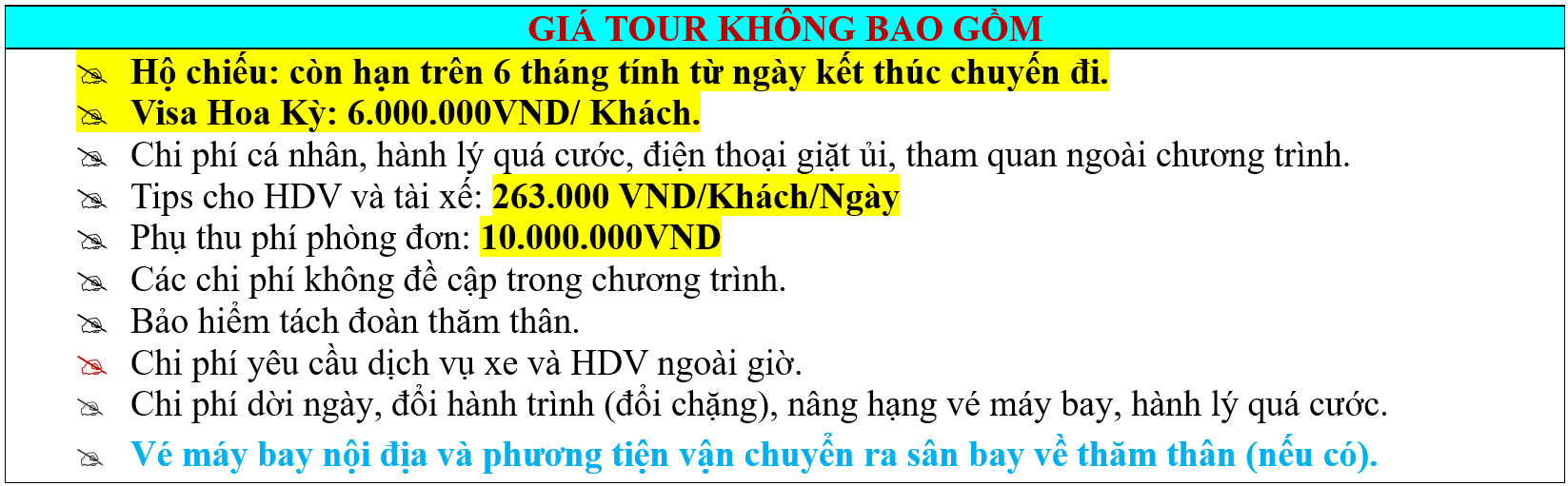 GIÁ TOUR KHÔNG BAO GỒM