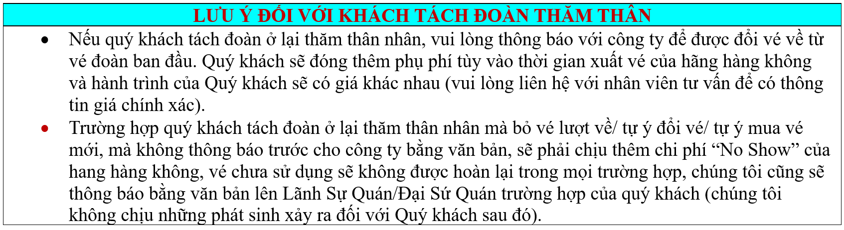 LƯU Ý ĐỐI VỚI KHÁCH TÁCH ĐOÀN THĂM THÂN