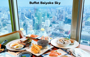 - Tặng FREE Buffet với hơn 100 món ăn Âu – Á tại tòa nhà 86 tầng cao nhất Thái Lan: Baiyoke Sky vừa thưởng thức ẩm thực thượng hạng, vừa ngắm toàn cảnh Bangkok trên cao.