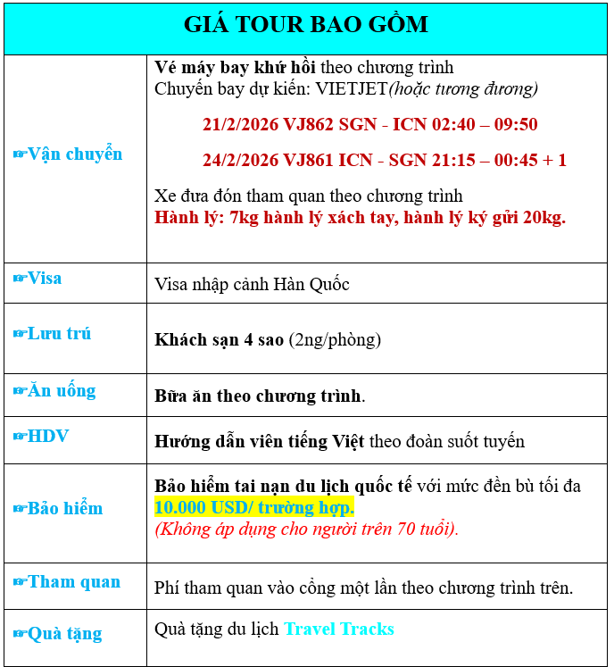 o 24/2/2026 VJ861 ICN – SGN 21:15 – 00:45 + 1 ((Bao gồm 7kg hành lý xách tay + 20kg hành lý ký gửi)