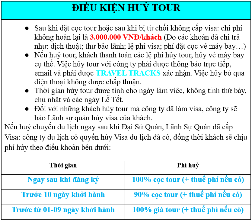 ● Trường hợp Quý khách không được xuất cảnh và nhập cảnh vì lý do cá nhân và thân nhân, công ty sẽ không chịu trách nhiệm và sẽ không hoàn trả tiền tour, Quý khách tự chi trả chi phí phát sinh nếu có.