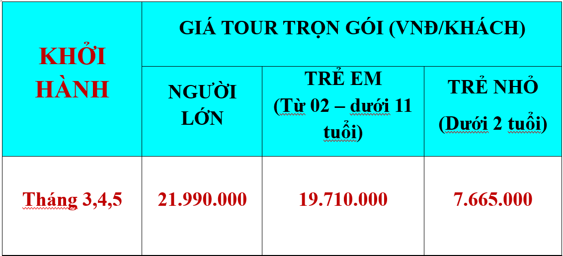 GIÁ TOUR TRỌN GÓI (VNĐ/KHÁCH)