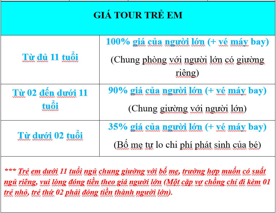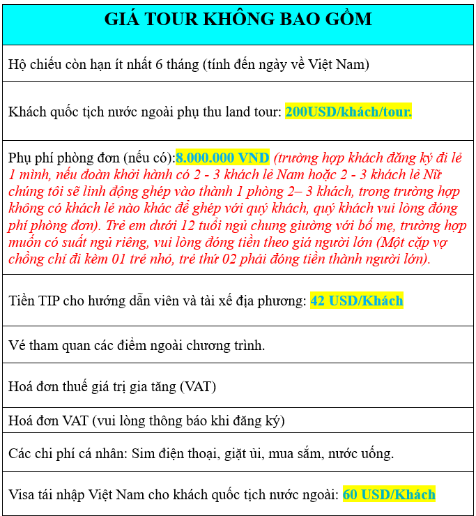● Khách quốc tịch khác Việt Nam sẽ phụ thu 200usd/khách/tour.