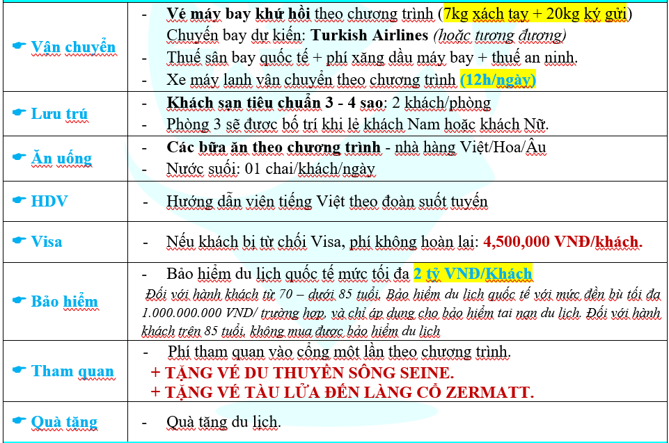 ● Không nhận khách hàng từ 80 tuổi trở lên & khách hàng mang thai từ tháng thứ 5 trở lên. Khách hàng mang thai vui lòng thông báo ngay khi đăng ký tour để được tư vấn.