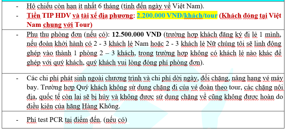 - + Hoàn tất số tiền còn lại sau trước ngày khởi hành 10 ngày (không tính ngày lễ, tết và thứ 7, chủ nhật)