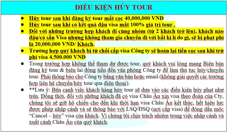 ● Trường hợp đoàn không đủ 15 khách khởi hành (15 khách đi và về theo hành trình tour), Công ty có quyền thay đổi, dời tour sang ngày khởi hành gần nhất. Nếu khách hàng không sắp xếp được công việc để tham gia tour kế tiếp, chúng tôi sẽ hoàn trả lại tiền cọc tour/tiền tour sau khi đã trừ đi lệ phí xin visa của các khách mà không chịu thêm bất kỳ chi phí và trách nhiệm nào (Thủ tục trả Visa của quý khách vui lòng xem phần lưu ý).