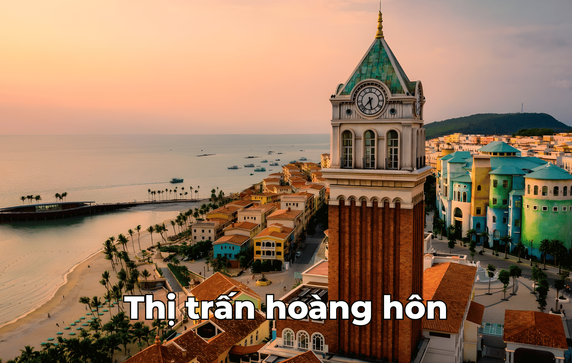- Thị Trấn Hoàng Hôn: Địa điểm du lịch hàng đầu tại Phú Quốc, mang đậm phong cách Địa Trung Hải với các biểu tượng nổi bật như Cáp treo Hòn Thơm, Cầu Hôn, Tháp Đồng Hồ,…
